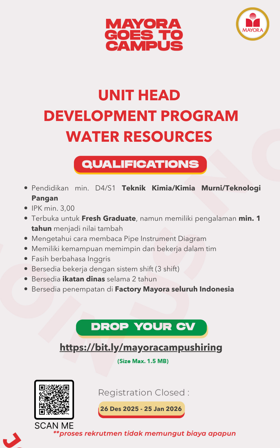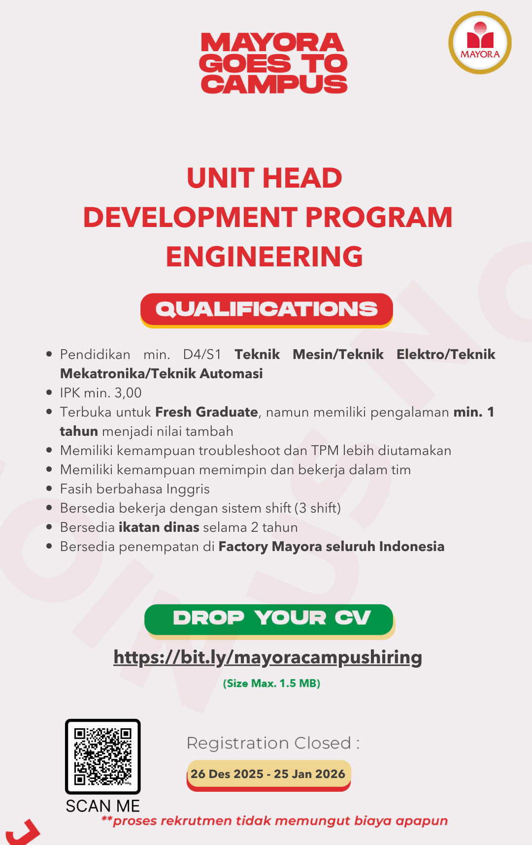 SelengkapnyaPT. Tirta Fresindo Jaya (Mayora Group) Perusahaan Fast Moving Consumer Goods (FMCG) yang bergerak di bidang produksi makanan dan minuman. Kami bermaksud melakukan proses rekrutmen di Universitas Jenderal Achmad Yani bagi lulusan Teknik Mesin, Teknik Elektro, Teknik Industri dan Management. untuk beberapa posisi...