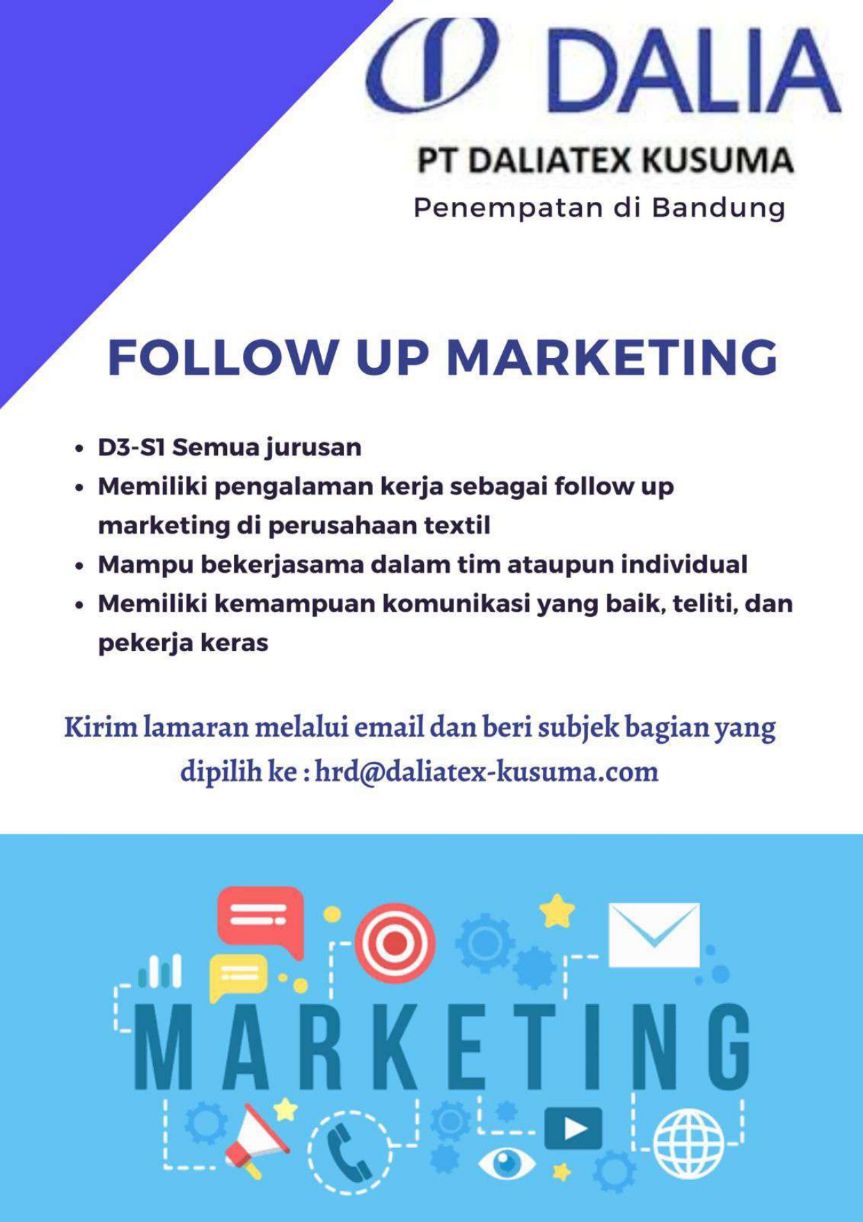 PT. Daliatex Kusuma perusahaan tekstil membutuhkan beberapa tenaga kerja muda untuk memenuhi tenaga kerja di perusahaan kami, adapun posisi yang dibutuhkan diantaranya: 1. Digital ADS Manager 2. E-Commerce 3. Kepala QC 4. Staff Produksi 5. Compliance Team 6. Engineering Elektronika 7. Merchandiser Kirim lamaran melalui email dan [...]