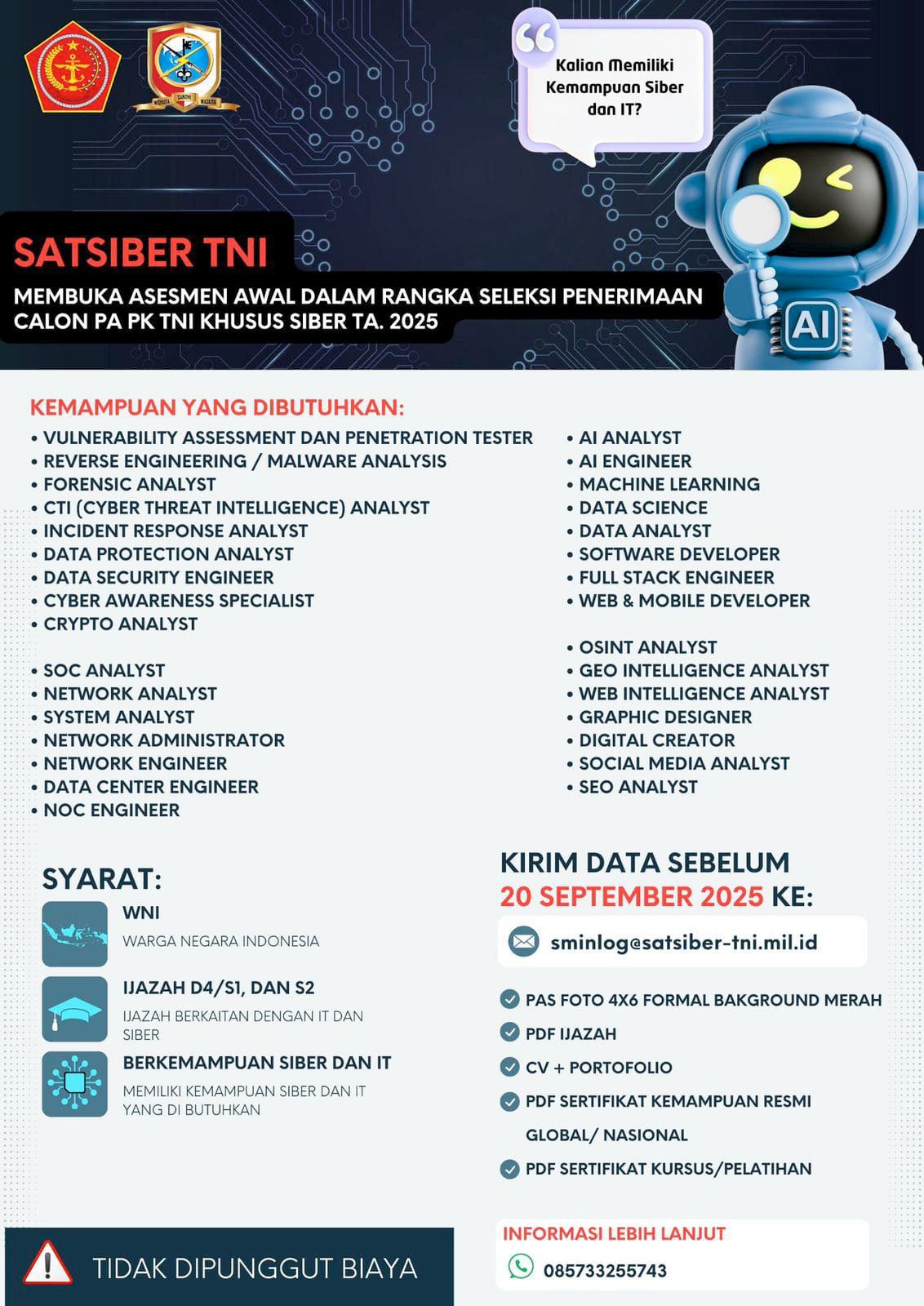Kirim data sebelum 20 September 2025 ke Email sminlog@satsiber-tni.mil.id