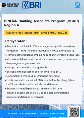 Saat ini Bank Rakyat Indonesia (BRI) memberikan kesempatan lowongan kerja untuk dapat bergabung bersama dengan posisi sebagai berikut: Relationship Manager (RM) SME TYPE A (JG.05)